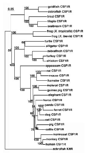 Fig. 2. Phylogenetic analysis of teleost, amphibian, reptile, avian and mammalian colony-stimulating factor-1 receptor (CSF1R) molecules. The phylogenetic tree was constructed from multiple deduced amino acid sequence alignments using the neighbor joining method and bootstrapped 10,000 times (denoted as %). The zebrafish KitR was used as outgroup to root the tree.