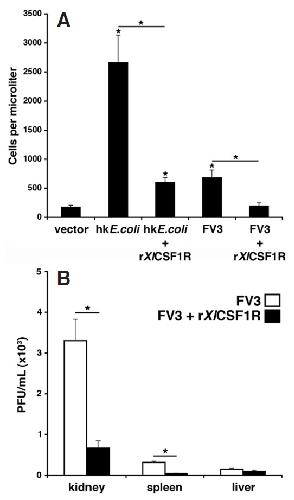 Fig. 7. The rXlCSF1R abrogates heat-killed E. coli and Frog Virus 3 elicited recruitment of tadpole peritoneal leukocytes and reduces FV3 dissemination. (A) Tadpoles were injected with vector control, heat-killed (hk) E. coli, FV3 (104 PFU), a combination of hk E. coli and rXlCSF1 (1mg) or a combination of FV3 (104 PFU) and rXlCSF1R (1mg). After 24hrs peritoneal phagocytes were lavaged and enumerated. Results are means ± SEM, N=4. (*) denotes statistical difference from the vector control and the (*) above lines denotes significant difference between treatment groups indicated by the lines, P<0.05. (B) Tadpoles were injected with 1x104 PFU of FV3 alone, or in combination with 1mg of rXlCSF1R. Following 24 hrs, tadpoles were sacrificed; their tissues were isolated and examined for infectious FV3 burdens by plaque assays. Results are means ± SEM, N=3. (*) above lines denotes significant difference between treatment groups indicated by the lines, P<0.05.