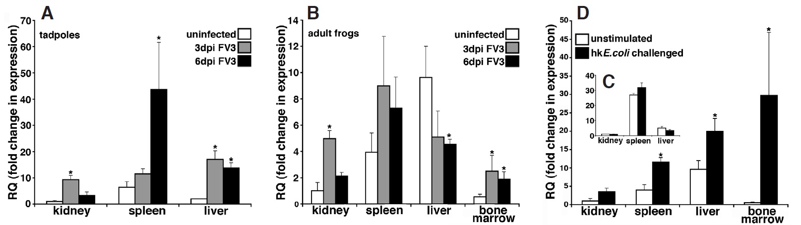 Fig. 4. Quantitative analysis of colony-stimulating factor-1 receptor (CSF1R) tissue gene expression in Frog Virus 3 (FV3) and heat-killed E. coli challenged tadpoles and adult X. laevis. Tadpoles (Stg. 54) and adult frogs (2 years-old) were infected by ip injections with 1x104 and 5x106 PFU of FV3, respectively. Alternatively, tadpoles and adult frogs were injected respectively with 10ml and 100ml of heat-killed (hk) E. coli. (A) FV3-infected tadpoleCSF1R gene expression. (B) FV3-infected tadult frog CSF1R gene expression. (C) Heat-killed E. coli-stimulated tadpoleCSF1R gene expression. (D) Heat-killed E. coli-stimulated adult frogCSF1R gene expression. All gene expression analysis was performed via the delta^delta CT method using X. laevis CSF1R-specific primers, the expression examined relative to the GAPDH endogenous control and normalized against respective uninfected kidney expression. Results are means ± SEM, N=4 and the (*) above lines denotes significant difference between tissues indicated by the lines, P<0.05.