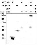 Fig. 5. In vitro rXlCSF1 and rXlCSF1R cross-linking studies. One microgram each of rXlCSF1, rXlCSF1R, rXlCSF1 + rXlCSF1R and BSA + rXlCSF1R were incubated in APBS (100ml final volume) for 30 min and cross-linked for 30 min using 2.5 mM DSS, final concentration. Cross-linking reactions were terminated by addition of 50 mM Tris (final concentration). Reactions were resolved and visualized using SDS-PAGE and western blot against the V5 epitopes on the recombinant proteins.