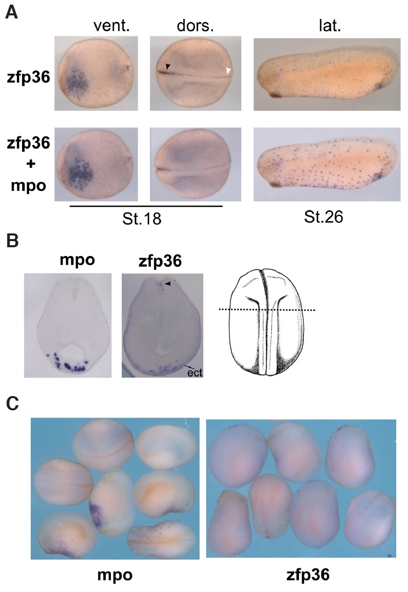 Fig.2. zfp36 mRNA is expressed in two different cell populations in early X. tropicalis embryos. Double sequential in situ hybridization (A) revealed for zfp36 and zfp36 + mpo in stage 18 and stage 26 embryos. Vibratome section of stage 20 embryos (B) stained for zfp36 or mpo as indicated. The cut plane is shown on the right panel. (C) Mixed view of stages 19-21 embryos stained for zfp36 or mpo. Arrowhead, anterior neural fold staining for zfp36, open arrowhead, posterior labeling of neural fold by zfp36.