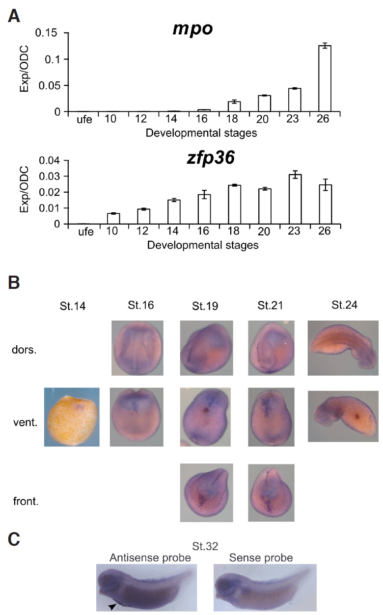 Fig. 3. Spatio-temporal expression of zfp36 mRNAs in X. tropicalis embryos. (A) RT-QPCR on total mRNA for the indicated stages of development for mpo and zfp36 mRNAs. Data are normalized to odc mRNAs. (B) Stage 14 to stage 24 X. tropicalis embryos are stained for zfp36 mRNAs and pictured form dorsal, ventral or frontal views. zfp36 mRNA is localized in the aVBI from stage 14 and along the neural fold starting from stage 19. (C) Stage 32 X. tropicalis embryos are stained for zfp36 mRNA with a sense or antisense probe as indicated. The dense ventral staining is indicated by an arrowhead.