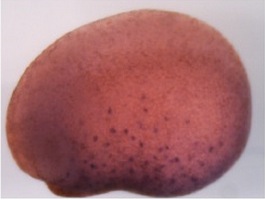 zfp36 (ZFP36 ring finger protein) gene expression in Xenopus tropicalis embryo, assayed via in situ hybridization, NF stage 26, lateral view, anteriorleft, dorsal up.