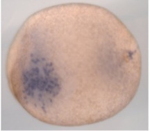 zfp36 (ZFP36 ring finger protein) gene expression in Xenopus tropicalis embryo, assayed via in situ hybridization, NF stage 18, ventral view, anteriorleft.
