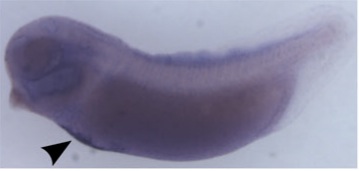 zfp36 (ZFP36 ring finger protein) gene expression in Xenopus tropicalis embryo, assayed via in situ hybridization, NF stage 32, lateral view, anteriorleft, dorsal up
