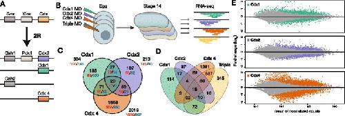 RESULTS: We examined the degree of regulatory and functional overlap between the three vertebrate Cdx genes using single and triple morpholino knock-down in Xenopus tropicalis followed by RNA-seq. We found that one paralogue, Cdx4, has a much stronger effect on gene expression than the others, including a strong regulatory effect on FGF and Wnt genes. Functional annotation revealed distinct and overlapping roles and subtly different temporal windows of action for each gene. The data also reveal a colinear-like effect of Cdx genes on Hox genes, with repression of Hox paralogy groups 1 and 2, and activation increasing from Hox group 5 to 11. We also highlight cases in which duplicated genes regulate distinct paralogous targets revealing pathway elaboration after whole genome duplication.