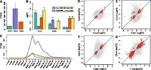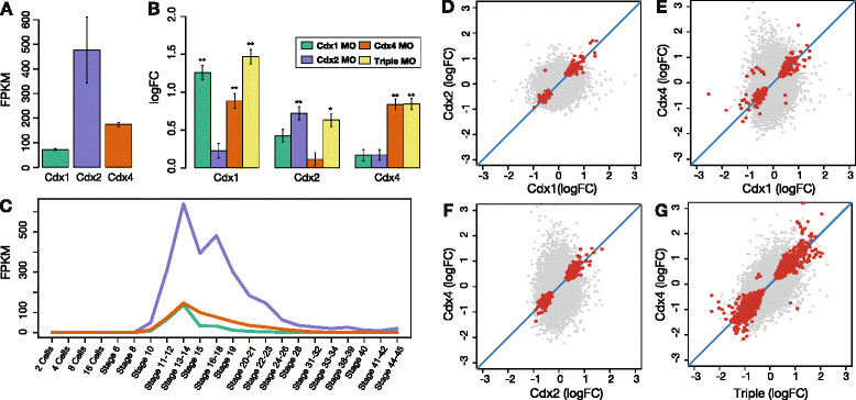 Cdx expression, cross-regulation, and pair-wise comparison. a Normalized expression of three Cdx paralogues at stage 14 derived from the control uninjected embryos. b Fold-change effect of alternative Cdx MOs on Cdx expression. Error bars indicate standard error; significance level noted as (**) and (*) for Benjamini-Hochberg-adjusted P <0.005 and <0.05, respectively. c Temporal expression profile of Cdx paralogues recovered from data of [25]. d–g Pairwise comparison of gene-specific fold-change triggered by distinct Cdx MOs. Genes with expression affected by both Cdx MOs are plotted as red dots, other genes plotted as grey dots