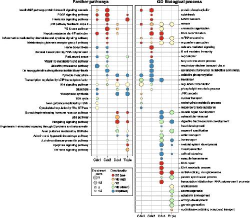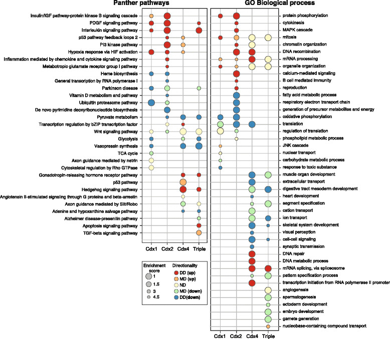 Fig. 4. Gene set enrichment analysis of Cdx MO effects. Functional annotation derived from Panther pathways and the GO biological process version of Panther database were employed for term enrichment analysis using distinct tests accounting for direction of expression change: distinct directional (DD), mixed directional (MD), non-directional (ND), as well as UP or DOWN regulation. The scheme yielding the best enrichment score was retained as the one providing the best description of the enrichment for the term (bubble fill colour). Displayed terms were retained as showing an enrichment >5 in at least one condition
