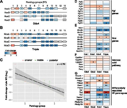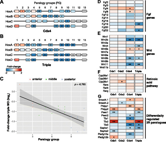 Distinct Cdx effect on known targets and 2R paralogues. Fold-change in expression induced by different Cdx MOs, or by triple Cdx MO injection, is indicated using a blue (down) to red (up) colour scale for each gene. a, b Schematized Hox gene clusters in X. tropicalis showing effects of Cdx gene knockdown on expression levels. Effects of Cdx4 (a) and triple injection (b) shown. Genes in grey are below expression cut-off (FPKM<2). c Fold-change in Hox gene expression caused by triple MO injection plotted against paralogy group assignment; each data point represents one Hox gene. Only genes with statistically significant change in expression are included. Colours denote anterior (red), middle (green), and posterior (blue) paralogy group assignments, assigning group 3 to anterior. d, e Heatmap representation of MO effect on Cdx target gene pathways: Fgf genes, Wnt genes, Retinoic acid pathway. Only genes expressed at stage 14 (FPKM>2) are included. g Effect of Cdx genes on pairs or triplets of genes originated through 2R vertebrate genome duplication (see Methods) which show differential regulation by distinct Cdx paralogues. Significance of differential expression is denoted by one (P <0.05) or two (P <0.005) asterisks (a, b, d–g)