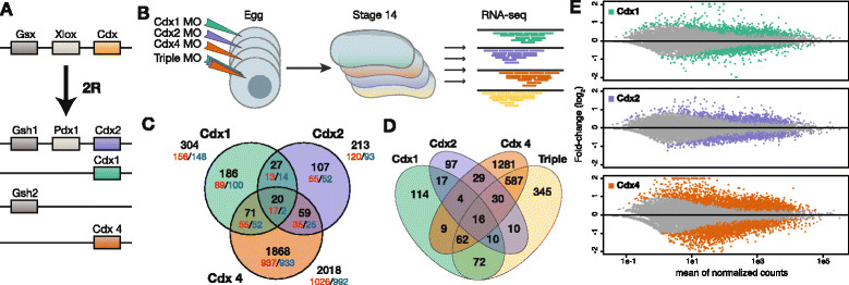 Transcriptomic assessment of Cdx paralogue function during Xenopus tropicalis development. a Duplication of the ancestral ParaHox cluster and subsequent gene loss in vertebrates resulting in three Cdx genes. b Experimental procedure: injection of eggs with morpholino oligonucleotides (MO) targeting specific Cdx copy, collection of stage 14 (early neurula) embryos for RNA extraction, and transcriptomic characterisation by RNA-seq. c Gene set overlap of the three Cdx MO targets inferred by differential expression analysis of RNA-seq data (see Methods). Venn diagram categories are specified for all genes (black), upregulated genes (red), and down-regulated genes (blue). d Gene set overlap for three Cdx MOs and co-injection of all three MOs (triple). e Gene expression and fold-change intensities across differential expression for all three Cdx MOs. Above scale fold-change values are noted as triangles. This representation reveals a strong quantitative extent of Cdx4 MO effect compared with Cdx1 and Cdx2 MOs
