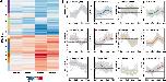Fig 3. K-mean clustering of multiple Cdx MOs effects. a Heatmap representation of gene expression fold-changes triggered by the three Cdx MOs and the co-injection triple MOs. Genes are arranged according to k-mean clustering and 12 clusters (left) are delineated to capture the diversity of responses to treatments. b Detail of gene expression response to Cdx MOs in the 12 selected clusters. The average response is plotted as a bold line while response of each member gene of the cluster is plotted in a thin grey line