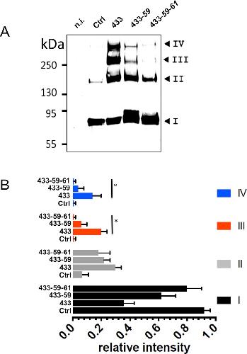 Fig 4. Contribution of cysteines C59 and C61 in the first transmembrane helix (TM1) to the stabilization of the ASIC1a complex by BMOE.A: ASIC1a oligomeric states, resolved by SDS-PAGE under reducing conditions and detected by anti-His-tag western blotting (same experimental procedure as in Fig 3A), of the His8-tagged forms of ASIC1a-ΔCCt as control (Ctrl), and the cysteine substitution mutant G433C-ΔCCt (433), G433C-C59V-ΔCCt (433–59) or G433C-C59V-C61S-ΔCCt (433-59-61). Numbers I to IV have the same meaning as in Fig 3. B: Relative intensities (mean ±SEM, n = 4) of each of the 4 bands (I to IV) for ASIC1a identified on SDS-PAGE from cells expressing ASIC1a-ΔCCt, (C), G433C-ΔCCt (433) G433C-C59V-ΔCCt (433–59) and G433C-C59V-C61S-ΔCCt (433-59-61). The average molecular weight estimated for the four bands I, II, III, IV are respectively 80±10, 160±6, 230±9 and 300±19 kDa (Mw±SD, n = 4) for the G433C-ΔCCt, G433C-C59V-ΔCCt, and G433C-C59V-C61S-ΔCCt constructs. * denotes p<0.01 |