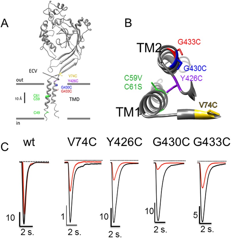 Fig 2. Native cysteines and cysteine substitutions in the transmembrane domain of ASIC1a.A: Model structure of a human ASIC1a subunit based on the chicken ASIC1 crystal structure as published elsewhere [4]: the subunit is made of 2 transmembrane α helices (TM1 and TM2); the cysteines C49, C59 and C61 in the transmembrane α helix 1 (TM1) are shown in green. The substituted cysteines G430C and G433C are in the TM2, and V74C and Y426C are located at the entrance of the channel pore in the extracellular vestibule (ECV). B: Top view of the transmembrane α helices TM1 and TM2 of a single ASIC1a subunit, with the pore lining residues G433C and G430C according to Li et al. 2011. C: Representative recordings of ASIC1a currents elicited at pH 5.5 in the absence (black) or in the presence (red) of 100 μM Cd2+ in xenopus oocytes expressing either ASIC1a wt or the V74C, Y426C, G430C, G433C mutants. |