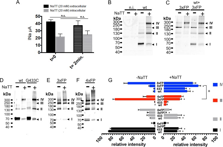 Fig 7. Oligomeric states of affinity-purified ASIC1a isolated from cells expressing functional ASIC1a trimeric and tetrameric concatemers, under oxidizing conditions.A: Effects of extracellular (black bars) or intracellular (grey bars) perfusion of NaTT (20 mM) on ASIC1a currents measured in Xenopus oocytes before (t = 0) and after perfusion (t = 2min.). Bars represents means ± SE (n = 28). B-C: Anti-ASIC1a western blots of control or NaTT-treated (0.3 mM NaTT) affinity-purified fractions from Xenopus oocytes, non-injected (n.i.), or expressing ASIC1a (B), or 3xFP alone or co-expressed with wt ASIC1a (C). D-F: Anti-ASIC1a western blots of affinity-purified fractions from ASIC1a in CHO cells expressing either ASIC1a monomers wt or G433C mutant (D), 3xFP (E), 4xFP (F) and treated with NaTT (0.3 mM). G: Relative intensities (mean ±SD) of each of the 4 bands (I to IV) corresponding to ASIC1a oligomers identified on SDS-PAGE from cells (Xenopus oocytes and CHO cells) expressing ASIC1a wt (n = 9), G433C (n = 5), 3xFP (n = 7), or 4xFP (n = 4), without or after treatment with 0.3 mM NaTT. * denotes p<0.01 |
