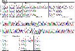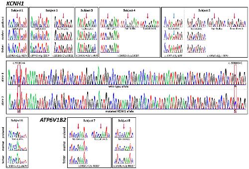 Supplementary Figure 1: Sequence electropherograms of individuals with KCNH1 or ATP6V1B2 mutation.. Sequence electropherograms showing the de novo origin of the identified KCNH1 and ATP6V1B2 missense mutations in subjects 1–8 (upper and lower panels, indicated by red arrows). The heterozygous state of three mutations was documented in peripheral leukocytes, hair bulb and/or buccal cells of subjects 4, 5 and 7, indicating germline origin. An additional previously annotated (ExAC database) heterozygous KCNH1 variant, c.125T>C (p.Ile42Thr), was present in subject 5 and his healthy mother (indicated by blue arrows). By cloning the KCNH1 exon 7–containing amplicon of subject 2 followed by sequencing, we determined the haplotypes and found that the two identified de novo changes c.974C>A and c.1066G>C are in cis (wild-type allele and mutated KCNH1 allele in the middle panel; mutated nucleotides are framed).