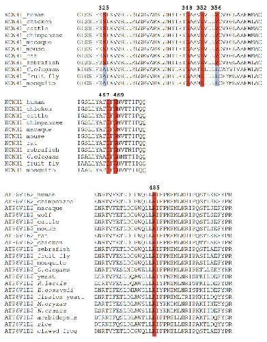 Supplementary Figure 2: Multiple protein sequence alignments around the KCNH1 and ATP6V1B2 amino acid substitutions from different species.