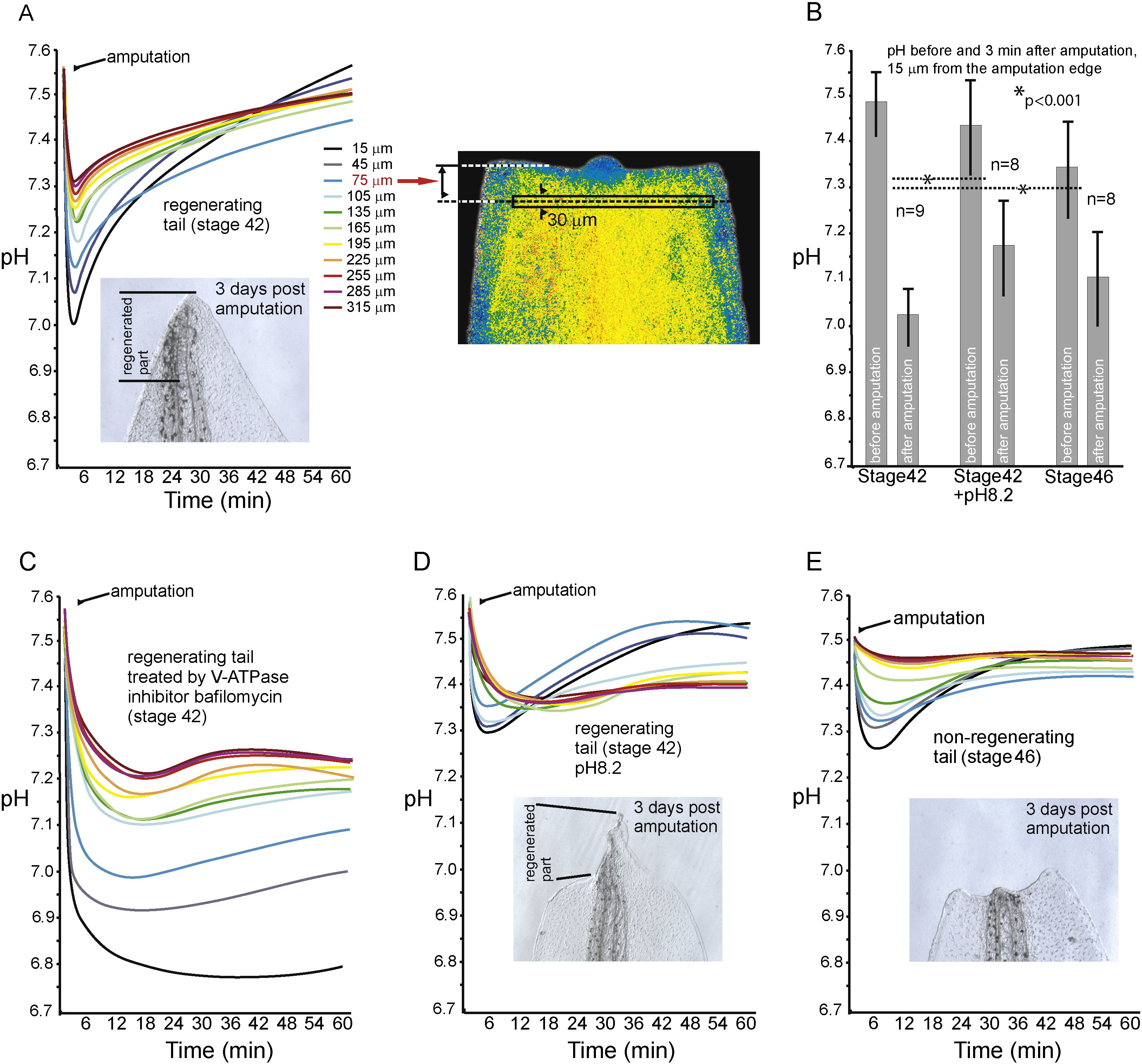 A) Typical dynamics of mean pH value changes as measured in ten transverse rectangular frames before amputation and during one hour after it (see the Materials and Methods section for details). Each of the dynamics curves is marked by a specific color, beginning with the black color, which is assigned to the frame nearest to the amputation edge. The position of each frame from the amputation edge to the middle of the frame is indicated in microns. Inset image shows the tip of the same regenerating tail 3 days following amputation. An example of the amputated tail in pseudocolors corresponding to SypHer-2 ratio, with one measuring frame located 75 μm from the amputation edge is shown on the right. Note that the blue color on the sides of the tail is a specific characteristic of this particular tail in which the injected SypHer-2 mRNA is absent in cells of the lateral sides of the tail. Due to a low auto-fluorescence of the tail tissues the ratio of fluorescence intensities in the lateral regions appears to be different from zero and appears as a constant blue pseudocolor. Notably, the auto-fluorescence intensity is more than 10-fold lower than the intensity of signal generated even by a low amount of SypHer-2. B) Mean value of pH near the amputation edge (measuring frame with the median at 15 μm from the edge) before amputation and in the minimum of pH dynamics curve of stage 42 tails (left pair of bars), stage 42 tails of tadpoles treated by pH 8.2 solution for 2 h before amputation (middle pair of bars) and stage 46 tails (right pair of bars). Standard deviation is indicated for each bar. The numbers show total number of tails in which pH was measured at the level of 15 μm from the amputation edge before and after amputation. C) representative dynamics of mean pH value measured as described in A, but in tails of stage 42 tadpoles treated with a V-ATPase inhibitor bafilomycin (200 nM for 1 h before amputation). D) Representative dynamics of mean pH value measured as described in A, but in tails of stage 42 tadpoles treated by pH 8.2 solution for 2 h before amputation. Inset image shows tip of the same tail after 3 days of amputation. E) Representative dynamics of mean pH value measured as described in A, but in tails of stage 46 tadpoles. Inset image shows tip of the same tail after 3 days of amputation.