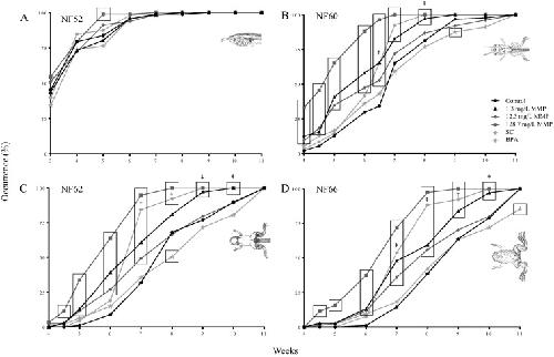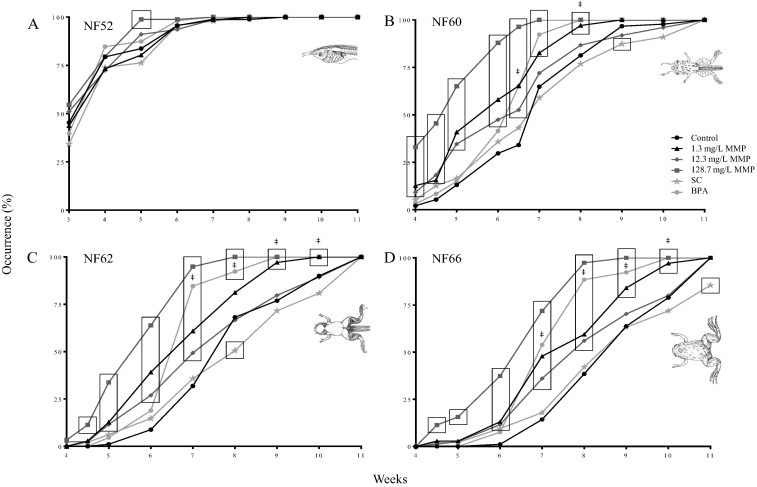 Effects of monomethyl phthalate on Western clawed frog metamorphosis. Metamorphosis starts by the occurrence of hind limbs (NF52; A), then the development of front limbs (NF60; B), a change in head width (NF62; C), and finally the regression of the tail (NF66; D). Data are expressed as percentage of animals that have reached each developmental stage. Each replicate contained 39–100 animals. Boxes indicate statistically significant differences between treatments and the control, while the symbol ‡ indicates statistically significant differences between the positive control and the solvent control. Data among the three MMP treatments were not statistically different. Legend: BPA: 3.0 mg/L bisphenol A as positive control, C: water-only control, MMP: monomethyl phthalate, and SC: solvent control for BPA (0.01% v/v DMSO). Stage drawings found on each figure panel are from Nieuwkoop and Faber (1994).