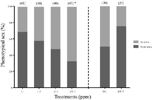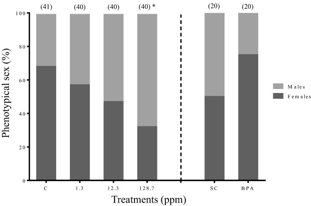 Effects of monomethyl phthalate on Western clawed frog sex ratio following 11 weeks of exposure. Data are expressed as percentage of male and female per treatment. Sex ratios were determined from 20 to 41 animals per treatment. The asterisk indicates a statistically significant difference between 128.7 mg/L MMP and the water-only control. Legend: BPA: 3.0 mg/L bisphenol A as positive control, C: water-only control, MMP: monomethyl phthalate, and SC: solvent control for BPA (0.01% v/v DMSO).