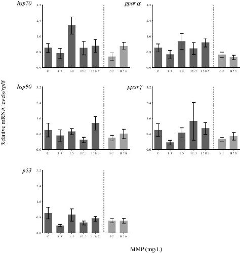Expression of cellular stress- and peroxisome-related genes in Western clawed frogs after 11 w of exposure to monomethyl phthalate. Data are presented as mean ± SEM. Ribosomal protein L8 (rpl8) was used as control gene to normalize the expression of target genes.