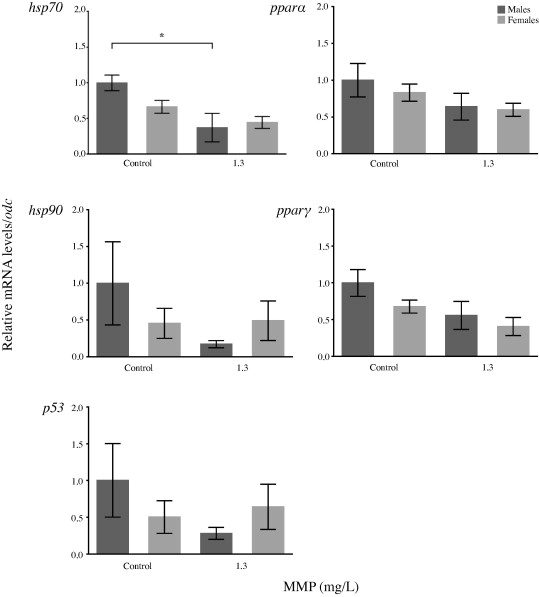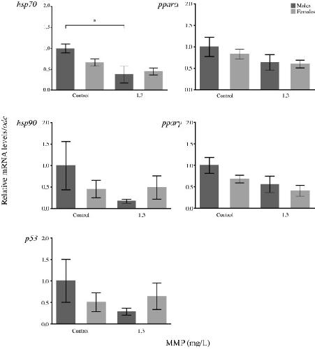 Expression of cellular stress- and peroxisome-related genes in Western clawed frogs after 51 w of exposure to monomethyl phthalate. Data are presented as mean ± SEM. Ornithine decarboxylase (odc) was used as control gene to normalize the expression of target genes. The asterisk indicates a statistically significant difference between the males from the water-only control and the males from the 1.3 mg/L MMP.