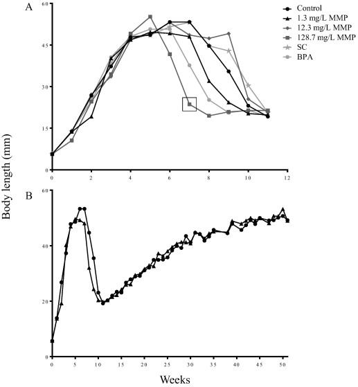 Effects of monomethyl phthalate on Western clawed frog body length after exposure of (A) 11 w and (B) 51 w. Data are expressed as mean. Every week, between 6 and 10 animals were measured from mouth to tail (NF46–NF66) and or from snout-to-vent (NF66 and on). The box indicates a statistically significant difference between the highest MMP concentration and the water-only control. Legend: BPA: 3.0 mg/L bisphenol A, C: water-only control, MMP: monomethyl phthalate, and SC: solvent control for BPA (0.01% v/v DMSO).
