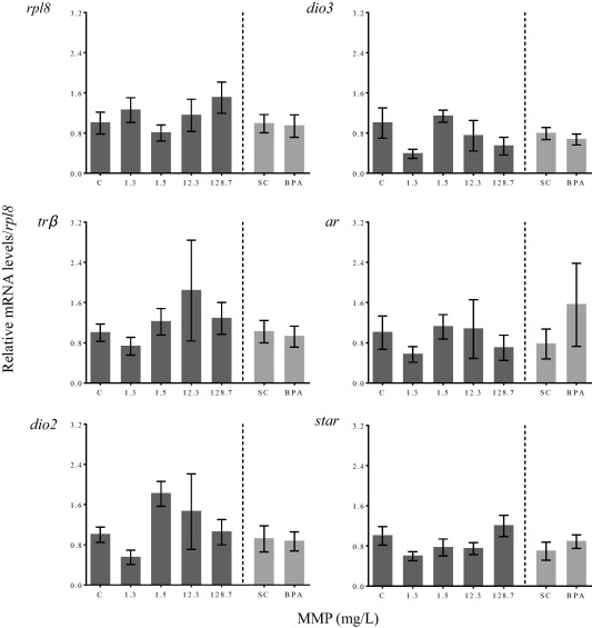 Expression of thyroid hormone- and reproduction-related genes in Western clawed frogs after 11 w of exposure to monomethyl phthalate. Data are presented as mean ± SEM. Ribosomal protein L8 (rpl8) was used as control gene to normalize the expression of target genes.