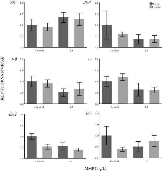 Expression of thyroid hormone- and reproduction-related genes in Western clawed frogs after 51 w of exposure to monomethyl phthalate. Data are presented as mean ± SEM. Ornithine decarboxylase (odc) was used as control gene to normalize the expression of target genes.