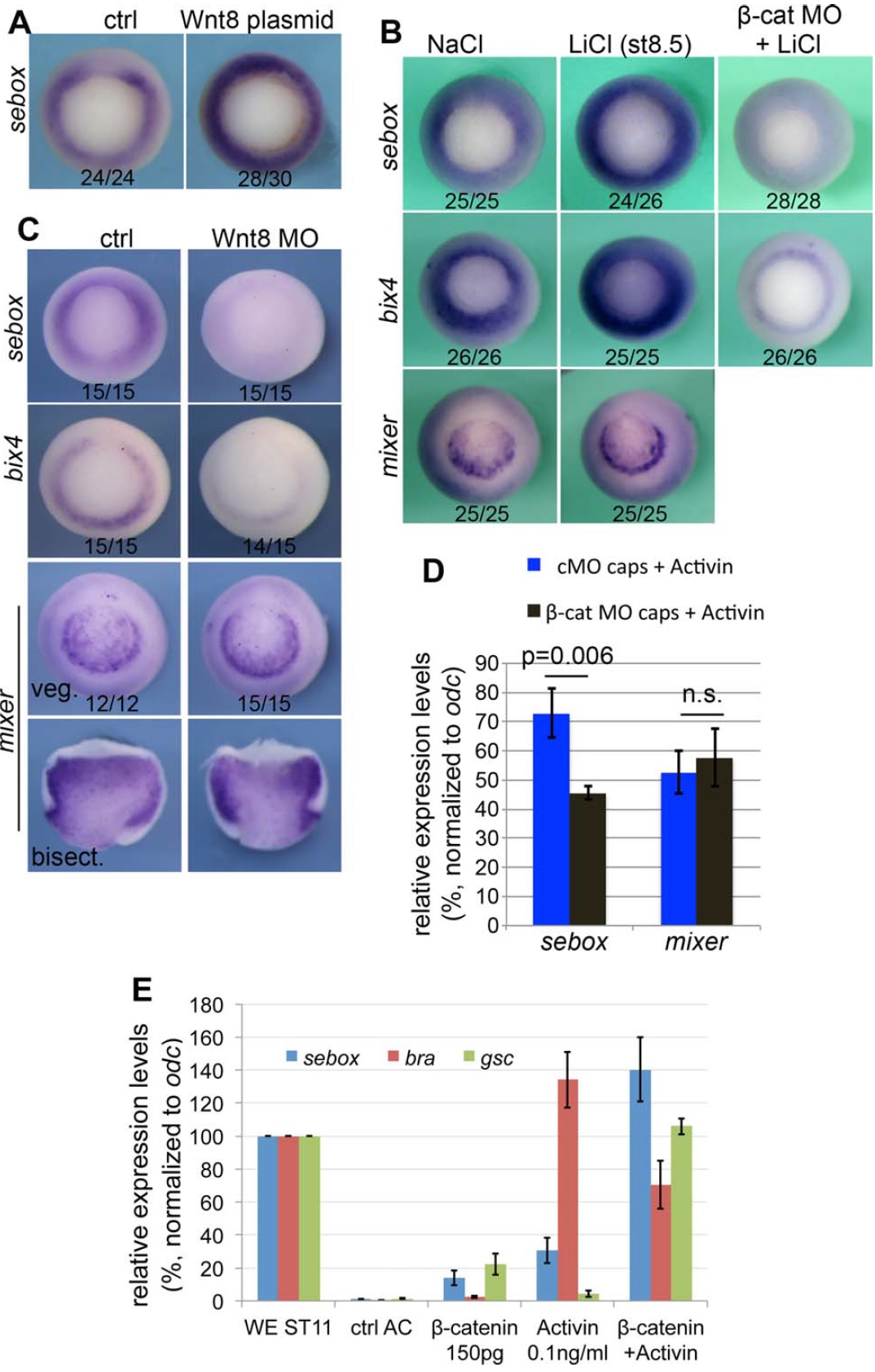 without 40 pg Wnt8 plasmid at the two-cell stage. B: WISH for sebox, bix4 and mixer expression in embryos with the indicated treatments.