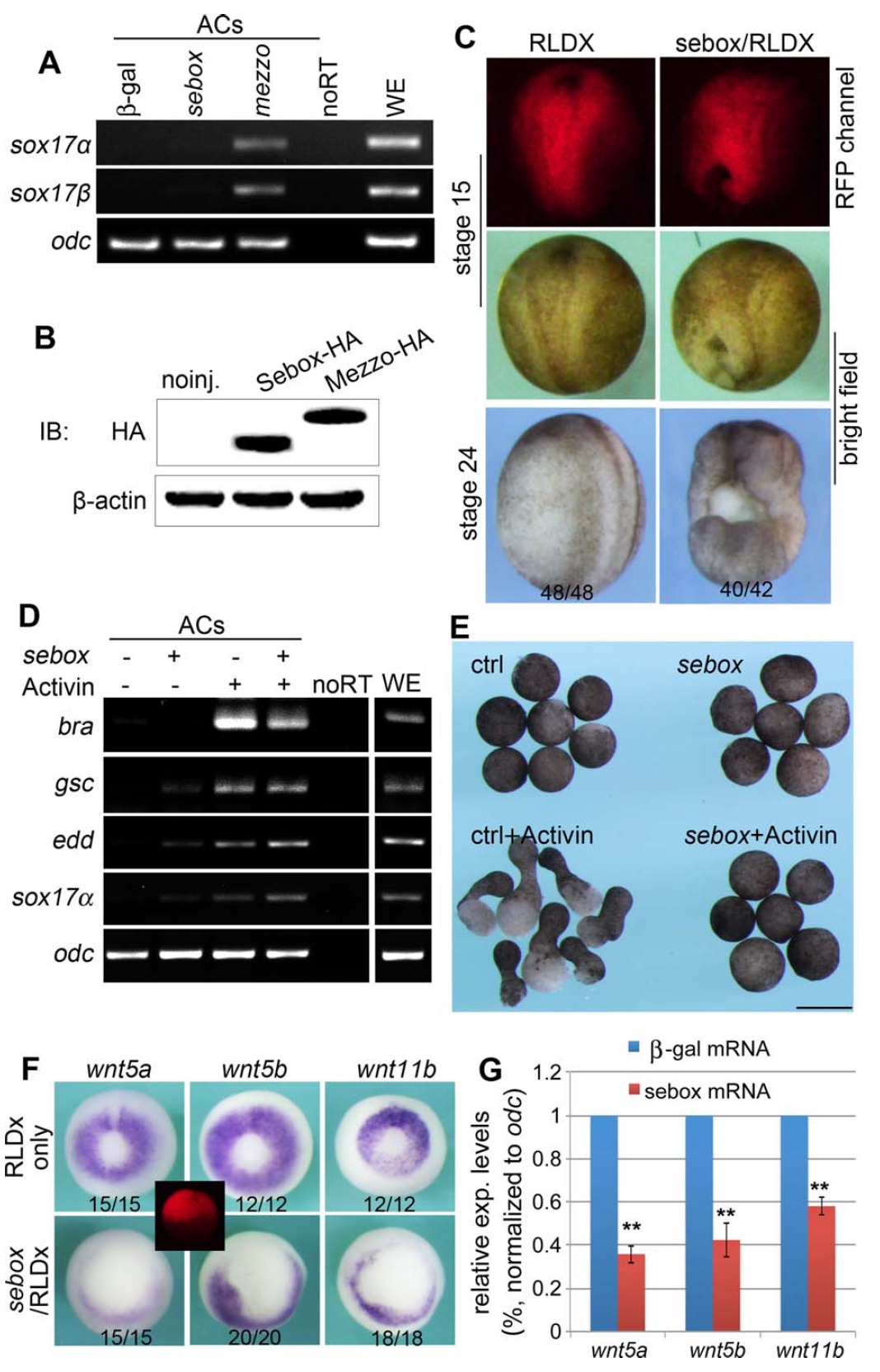 bar¼1 mm. F: WISH for wnt5a, wnt5b and wnt11b expression in stage 11 embryos injected with 400 pg sebox mRNA into the dorsal part at the