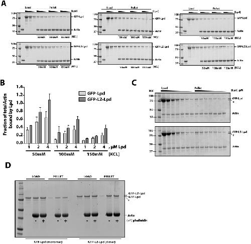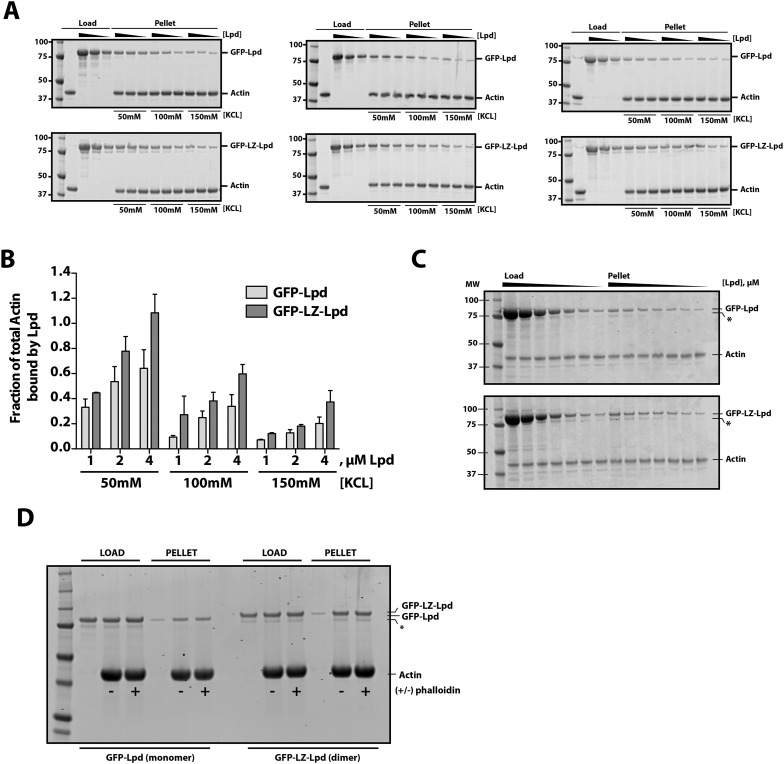Figure 1—figure supplement 1. Interactions between filamentous actin, GFP-Lpd (850–1250aa), and GFP-LZ-Lpd (850–1250aa) measured by cosedimentation at different buffer ionic strengths.(A) Monomeric GFP-Lpd850−1250aa and dimeric GFP-LZ-Lpd850−1250aa interact with filamentous actin in the presence of 50, 100, 150 mM KCl. SDS-PAGE from three experiments showing the cosedimentation of 2 µM filamentous actin (+4 µM dark phalloidin) in the presence of 1, 2, and 4 µM GFP-Lpd850−1250aa or GFP-LZ-Lpd850−1250aa (monomeric protein concentration). Buffer composition is 20 mM HEPES [pH 7], 50–150 mM KCl, 0.5 mM ATP, 0.5 mM MgCl2, 0.5 mM EGTA. (B) Average molar ratio of GFP-Lpd or GFP-LZ-Lpd bound to filamentous actin in the presence of 50, 100, and 150 mM KCl. Error bars represent S.D. of the mean (n = 3 experiments). (C) SDS-PAGE as in Figure 1H, showing the results of co-sedimentation of 1 µM filamentous actin in the presence of increasing concentrations of GFP-Lpd or GFP-LZ-Lpd (0–10 µM monomer concentration). (D) GFP-Lpd and GFP-LZ-Lpd interact with both ‘native’ and phalloidin stabilized actin filaments. Actin was polymerized at a concentration of 20 µM in the absence (termed ‘native’) or presence of an equal molar concentration of dark phalloidin (indicated by ‘+’). After 45 min, filamentous actin was combined with an equal volume of either 2 µM GFP-Lpd850−1250aa or GFP-LZ-Lpd850−1250aa and incubated for 1 hr before ultracentrifugation (also see ‘Materials and methods’). The final buffer composition was 20 mM HEPES [pH 7.0], 100 mM KCl, 1 mM TCEP, 0.5 mM ATP, 0.5 mM MgCl2, and 0.5 mM EGTA. (C, D) Asterisks (*) on SDS-PAGE gel marks partially translated or proteolyzed GFP-Lpd and GFP-LZ-Lpd that could not be removed during the purification.DOI: http://dx.doi.org/10.7554/eLife.06585.004 |