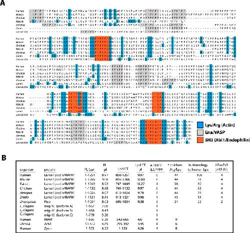 Figure 2. Conservation of Lpd (850–1250aa) amino acid sequence and isoelectric point (pI).(A) Protein sequence alignment of human Lpd and homologs C-termini. Basic amino acid residues (arginine and lysine) are highlighted in blue. Gray boxes mark the location of the canonical Ena/VASP homology 1 (EVH1) BDs (i.e., FPPPP or LPPPP), while red boxes highlight the predicted Abi1/endophilin SH3 domain binding sites (i.e., PxxPxR). Secondary structure prediction algorithms suggest that the Lpd (850–1250aa) lacks secondary structure (data not shown). (B) Comparison of Lpd, Pico, mig-10, RIAM, ActA, and Zyxin pIs across the canonical Ena/VASP BD containing one or more FPPPP motifs. Domain boundaries for this region are termed, Lpd C-terminus (Lpd CT). The number of arginine and lysine residues were calculated across the region specified ‘Lpd C-terminus (Lpd CT)’. The number of Ena/VASP and SH3 domain binding sites were counted across the domain boundaries defined, Lpd CT, and are shown in columns five and six, respectively. The pIs for Lpd CT were calculated using EXPASY (Wilkins et al., 1999). Abbreviations are as follows: full-length (FL); binding-domain (BD); Lamellipodin (Lpd).DOI: http://dx.doi.org/10.7554/eLife.06585.005 |