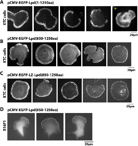 Figure 4—figure supplement 1. Localization of GFP-Lpd (850–1250aa) and GFP-LZ-Lpd (850–1250aa).(A, C) Representative images showing the plasma membrane localization of (A) GFP-Lpd1−1250aa, (B) GFP-Lpd850−1250aa, and (C) dimeric GFP-LZ-Lpd850−1250aa visualized with TIRF microscopy in XTC cells spread on PLL. Image in (A), marked with asterisk (*), is a representative cell imaged using with wide-field epifluorescence. Note the cytoplasmic localization of GFP-Lpd1−1250aa is not visible by TIRF microscopy. Scale bar, 20 µm. (D) Representative images of GFP-Lpd850−1250aa localization in polarized B16F1 cell migrating on laminin coated glass and imaged with wide-field epifluorescence. Scale bar, 20 µm.DOI: http://dx.doi.org/10.7554/eLife.06585.009 |