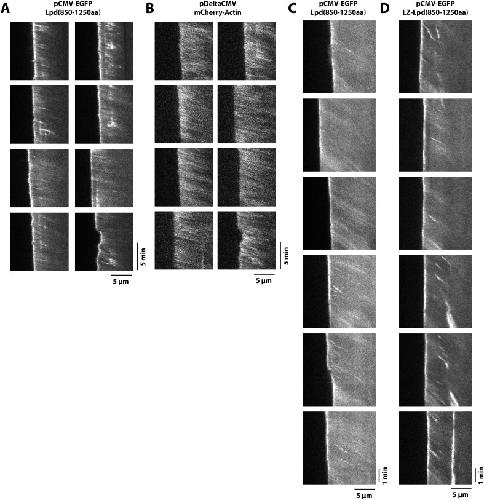 Figure 4âfigure supplement 2. Retrograde flow of GFP-Lpd (850â1250aa) and GFP-LZ-Lpd (850â1250aa) with the actin cytoskeleton.(A, B) Representative kymographs showing retrograde flow of (A) monomeric GFP-Lpd850â1250aa and (B) mCherry-Actin in XTC cells. Images were acquired every 5 s. Scale bars, 5 µm and 5 min. (C, D) Representative kymographs showing retrograde flow of (C) monomeric GFP-Lpd850â1250aa and (D) dimeric GFP-LZ-Lpd850â1250aa. Compared to (A, B), images were acquired every 2 s. Scale bars, 5 µm and 1 min.DOI: http://dx.doi.org/10.7554/eLife.06585.010 |