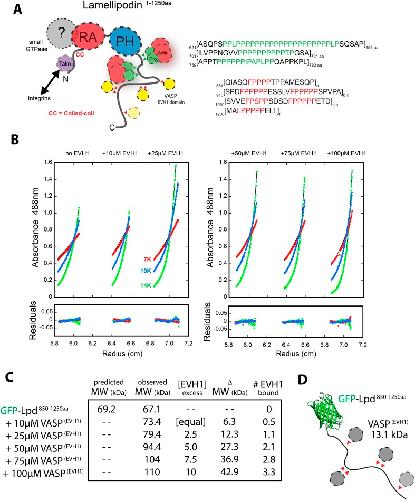 Figure 5—figure supplement 1. Lpd-VASP binding stoichiometry determined by sedimentation equilibrium.(A) Cartoon showing domain organization of human Lpd (1–1250aa). (B) Analytical ultracentrifugation sedimentation equilibrium traces for GFP-Lpd850−1250aa in the absence (left) and presence of 10, 25, 50, 75, 100 µM VASP1−114aa EVH1 domain. (C) Table showing the predicted and observed molecular weight of GFP-Lpd850−1250aa in absence and presence of different VASP1−114aa EVH1 domain protein concentrations. (D) Cartoon showing GFP-Lpd850−1250aa with VASP1−114aa EVH1 domains (grey spheres) binding to FPPPP sites (red triangles). Based on the observed binding stoichiometry between GFP-Lpd850−1250aa and VASP1−114aa, we hypothesize that steric hindrance allows only a single EVH1 domain to interact with the tandem FPPPP motifs (i.e., SPDFPPPPPESSLVFPPPPPSPVPA and SVVEFPSPPSDSDFPPPPPETD). The crystal structure of GFP was derived from Yang et al. (1996) (1GFL.pdb).DOI: http://dx.doi.org/10.7554/eLife.06585.015 |