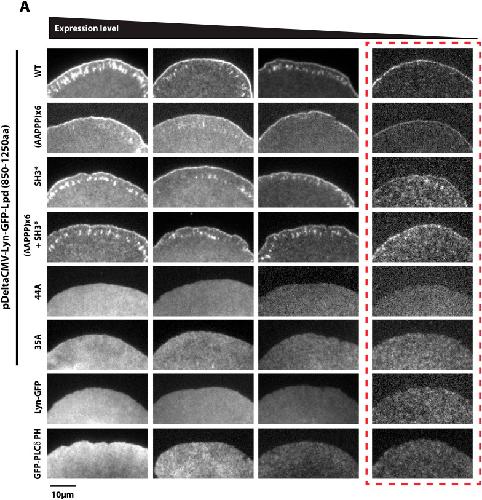 Figure 5—figure supplement 3. Membrane tethered Lyn-GFP-Lpd (850–1250aa) requires basic residue for leading edge localization.(A) Plasma membrane localization of Lyn-GFP-Lpd850−1250aa, wild-type and mutants, visualized using TIRF microscopy. Mutations affecting the interaction with either Ena/VASP proteins (AAPPP)x6 or Abi1/Endophilin (SH3*) did not abolish the leading edge localization of Lyn-GFP-Lpd850−1250aa. Mutating all lysine and arginine residues (44A) or only those outside of the Abi1/Endophilin SH3 BDs (35A) eliminated the leading edge localization of Lyn- GFP-Lpd850−1250aa. Membrane localization of Lyn-GFP-Lpd (44A and 35A) phenocopy the uniform distribution of membrane anchored Lyn-GFP. Cell images highlighted with the red dashed box include representative images of cells expressing low level of Lyn- GFP-Lpd850−1250aa. The intensity of these images was scaled differently than images to the left to better visualize the localization.DOI: http://dx.doi.org/10.7554/eLife.06585.017 |