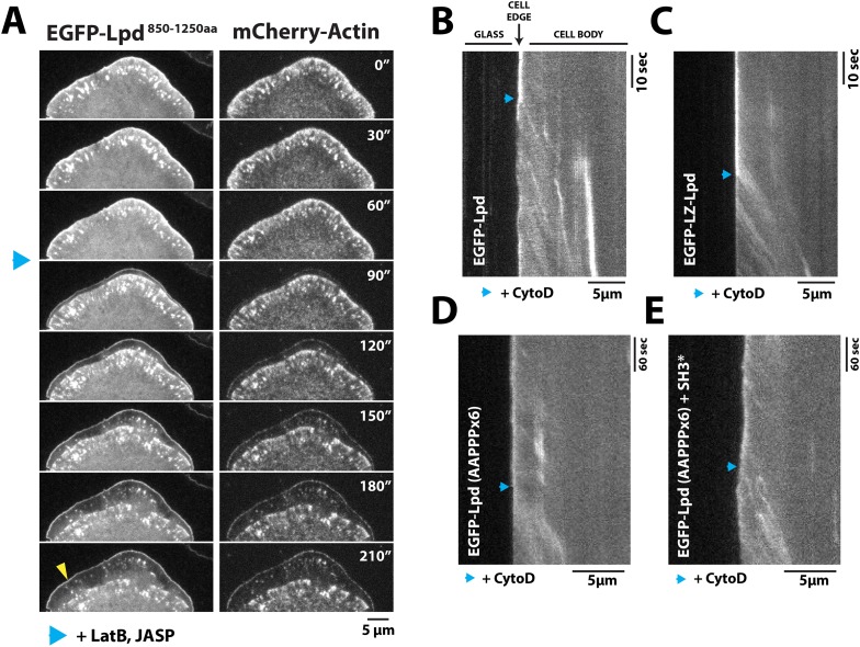 Figure 6. Dynamic actin filament assembly and free barbed ends are required for leading localization of GFP-Lpd (850â1250aa).(A) Dynamic actin assembly is required for maintenance of GFP-Lpd850â1250aa leading edge localization. Image montage showing translocation of GFP-Lpd850â1250aa and mCherry-Actin toward the cell body, following the addition of 8 µM Jasplakinolide and 10 µM Latrunculin B. Note that a population of GFP-Lpd850â1250aa remains associated with the peripheral membrane after addition of Jasp-LatB (yellow arrowhead). Horizontal scale bar, 5 µm. Vertical scale bar, 2 min. (BâE) Barbed ends are required for plasma membrane localization of (B) GFP-Lpd850â1250aa, (C) GFP-LZ-Lpd850â1250aa, (D) GFP-Lpd850â1250aa (AAPPP)x6, and (E) GFP-Lpd850â1250aa (AAPPPx6 + SH3*). Representative kymographs showing membrane dissociation of GFP-Lpd850â1250aa, wild-type and mutants, following the addition of 100 nM Cytochalasin D (blue arrowhead). Horizontal scale bar, 5 µm.DOI: http://dx.doi.org/10.7554/eLife.06585.019 |
