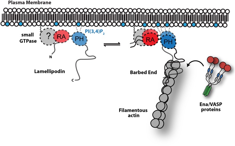 Figure 9. Model.Based on the canonical model (Krause et al., 2004), Lpd is recruited to actin based membrane protrusions through interactions with phosphatidylinositol lipids (i.e., PI(3,4)P2) and possibly small GTPases (i.e., Ras or Rho family). Similar to the Grb protein family, Lpd is predicted to form homo-dimers mediated by interactions between the coiled-coil and tandem RA-PH domain. We find that the C-terminus of Lpd (residues 850â1250) is sufficient for recruiting Lpd to leading edge membrane where it directly interacts with free barbed ends and/or the sides of the actin filaments. Importantly, this interaction between Lamelliopodin and filamentous actin can occur independently to those mediated by Ena/VASP proteins or SH3 domains (i.e., Abi1/endophilin). However, Ena/VASP proteins recruited to actin based membrane protrusion can simultaneously associate with free actin filament barbed ends and Lpd. By this mechanism, we speculate that the lifetime of membrane targeted and barbed end associated Ena/VASP proteins are extended at the plasma membrane.DOI: http://dx.doi.org/10.7554/eLife.06585.027 |