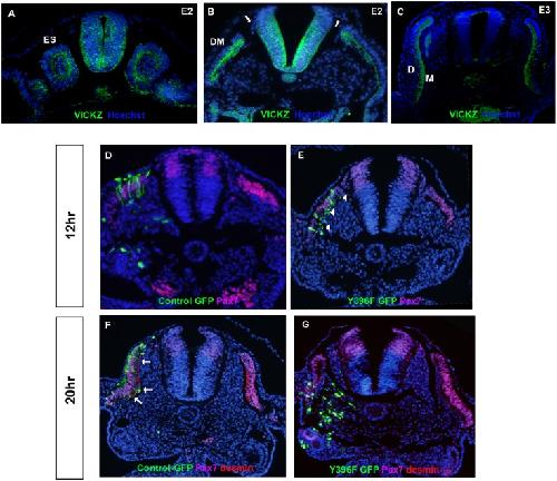 Fig 4. Down-regulation of VICKZ causes DM dissociation.(A-C) VICKZ is expressed in newly-formed somites in E2 embryos (A) particularly in the apical adherens junctions, and later in the early dermomyotome (B). In E3 embryos, VICKZ is down-regulated in the emerging dermis but maintained in the developing myofiber (C). (VICKZ is also down-regulated in the emigrating trunk NC cells (arrows in B)). (D-G) Embryos were electroporated with either control GFP (D, F) or Y396F-GFP (E, G) into the dorsal medial lip (DML) of early dissociating somites. Embryos were fixed either 12 (D,E) or 20 (F,G) hours post-electroporation and stained for the DM marker, Pax 7 (purple) and/or the myotome marker, Desmin (red). After 12 hours, control GFP-labeled DML cells retain their epithelial structure and are Pax7-positive (D) whereas many DML cells that received Y396F-GFP have begun rounding up and losing their epithelial pseudostratified morphology (E, arrowheads). By 20 hours post-electroporation, in the control-GFP embryos, GFP-positive, Desmin-positive myofibers derived from the DML occupy the medial-most aspect of the myotome (F, arrows). In Y396F-GFP treated embryos, however, the DM was completely dissociated, with GFP-positive, Pax7-negative cells having lost their epithelial morphology. None of the GFP-positive cells generated myofibers. Abbreviations: ES, epithelial somite; DM, dermomyotome; D, dermis; M, myotome. |
