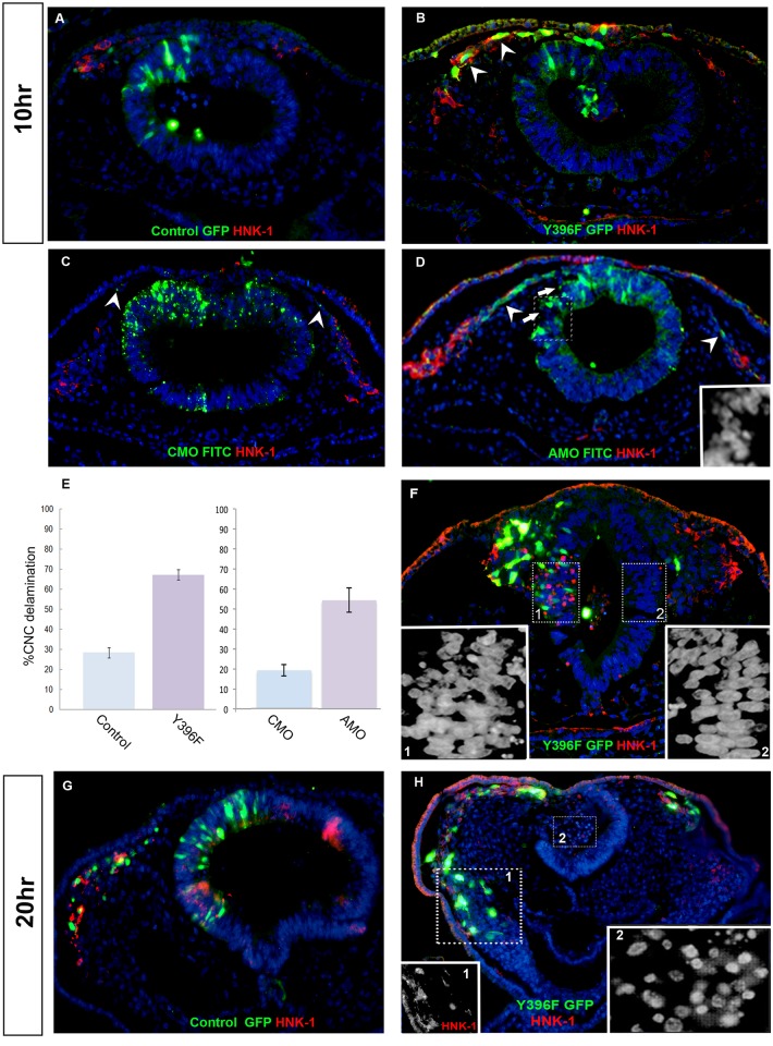 Fig 2. Down-regulation of VICKZ enhances CNC delamination and causes NT dissociation.2-4ss embryos were electroporated with either control GFP (A,G), Y396F-GFP (B,F,H), FITC labeled control morpholino (CMO) (C) or FITC labeled cVICKZ-antisense morpholino (AMO) (D) and fixed and sectioned either 10 hours (A,B,C,D,F) or 20 hours (G,H) post-electroporation. All sections were stained for HNK-1 expression (red) and GFP (green). (E) For each treatment, the percentage of the total number of GFP-positive cells that delaminated post-electroporation was calculated for each embryo (see Materials and Methods) and graphed as the mean ± SEM (N = 5). Y396F-treated embryos showed a 2.4-fold increase in delamination as compared to the controls; AMO-treated embryos showed a 2.8-fold increase in delamination compared to CMO-treated embryos. Insets in D, F and H (inset 2) show enlarged images of the nuclei in the corresponding rectangles indicated by the dotted lines. Inset 1 in H shows the red channel (HNK-1) outlined by the rectangle. Arrowheads indicate emigrating, electroporated CNC (B,C,D). Arrows in (D) indicate disorganization of the electroporated neuroepithelium. |
