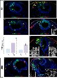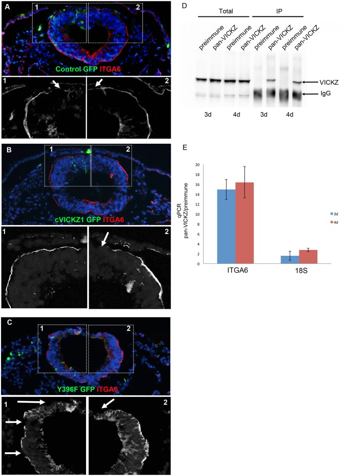Fig 6. VICKZ1 mediates Integrin α6 expression and co-immunoprecipitates with Integrin α6 mRNA.2-4ss embryos were electroporated with control-GFP (A), full length VICKZ1- GFP (B), or Y396F-GFP (C), and then fixed and stained for Integrin α6 (red) and GFP (green) 10 hours later. In control-GFP transfected embryos, Integrin α6 is down-regulated in the dorsal aspect of the tube in the region where CNC delaminate, on both the transfected and non-transfected sides (A, inset 1 and 2). Overexpression of VICKZ1 maintains Integrin α6 expression even in the most dorsal regions of the tube, but only on the transfected side (B, inset 1), and not on the non-transfected side (B, inset 2). Y396F expression causes a precocious emigration of CNC and down-regulation of Integrin α6 in more lateral regions of the tube, only on the transfected side (C, inset 1) and not on the non-transected side (C, inset 2). All insets show only the red channel (ITGA6). Arrows in insets indicate areas of downregulation of ITGA6. (D) RNP complexes were prepared from 3d and 4d old chick embryos and immunoprecipitated with either pre-immune serum or pan-VICKZ antibody. Equal volumes of total lysates (Total) and immunoprecipitates (IP) were subjected to western blot analysis using the pan-VICKZ antibody. VICKZ protein is pulled down exclusively by the pan-VICKZ antibody. (E) Quantitative RT-PCR analysis was performed on cDNAs prepared from both pre-immune and pan-VICKZ immunoprecipitations and tested for the presence of ITGA6 mRNA. Values of pan-VICKZ IP mRNA were normalized to the amounts of total mRNA, and compared to the pre-immune normalized values (pan-VICKZ/pre-immune). A 15–16 fold enrichment of ITGA6 mRNA is observed in the pan-VICKZ IP, as compared to the pre-immune serum. A control RNA, 18S, shows only 1–2 fold enrichment when analysed in the same way. The data show the mean±SEM. |