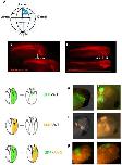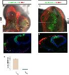Fig 3. Overexpression of cVICKZ1 inhibits CNC emigration.2-4ss embryos were electroporated with either control GFP (A,C) or cVICKZ1-GFP (B,D), and fixed 20 hours post-electroporation. Embryos were stained for HNK-1 expression (red) and GFP (green) and photographed either as whole mount preparations (A,B) or after sectioning (C,D). The grey dotted line in (A) and (B) indicate the plane of section shown in (C) and (D), respectively. Almost no CNC delamination occurs in the cVICKZ1-GFP embryos, although GFP-negative, HNK-1-positive cells emigrate normally. (E) The percentage of the total number of GFP-positive cells that delaminated by 20 hours post-electroporation was calculated for each embryo and was graphed as the mean ± SEM (N = 5). Abbreviations: E, eye. |