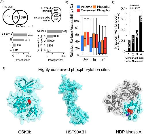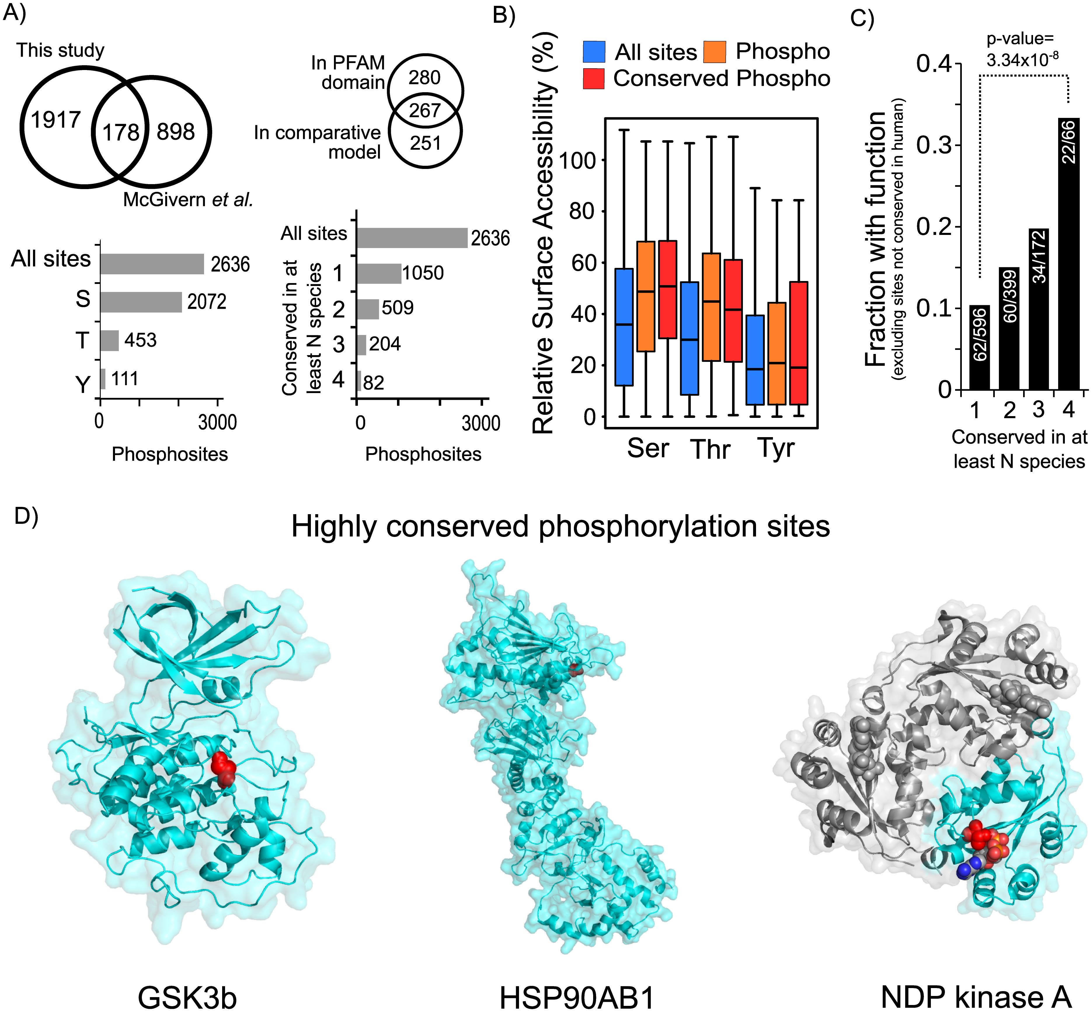 Fig 1. Structural and evolutionary analysis of X. laevis phosphosites. A) A total of 2636 non-redundant phosphorylation sites were compiled from the sites determined here and those collected from a previous study [29]. We determined the conservation of these 2636 phosphorylation sites across the 13 other species and obtained structural models for 518 of these sites. B) The all-atom residue relative surface accessibility was compared for all phospho-acceptor residues, phosphosites not conserved or conserved in at least one other species with available phosphorylation data. C) The fraction of X. laevis sites with a known function in human increases with the degree of conservation. X. laevis sites not conserved in human were excluded from this analysis. D) Example comparative models with highly conserved phosphorylation sites. The phosphorylation site is highlighted in red. For the NDP kinase A, the structure represents the homo-oligomeric complex. One of the subunits is indicated in blue, with the phosphosite position in red and the substrate in the ball-and-stick representation.