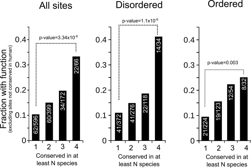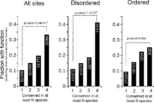 For each X. laevis phosphosite we counted the number of species in which the orthologous peptide region is also phosphorylated. We excluded all phosphosites that are not also phosphorylated in human. We then calculated the fraction of sites that are known to play a functional role in human. The degree of conservation is found to enrich significantly for sites with a known function for all X. laevis sites as well as sites that are in ordered or disordered regions. |