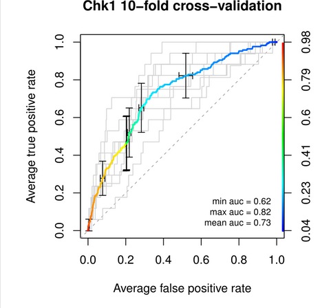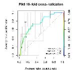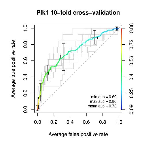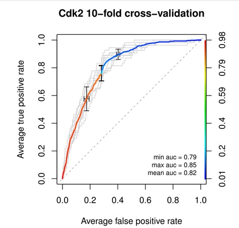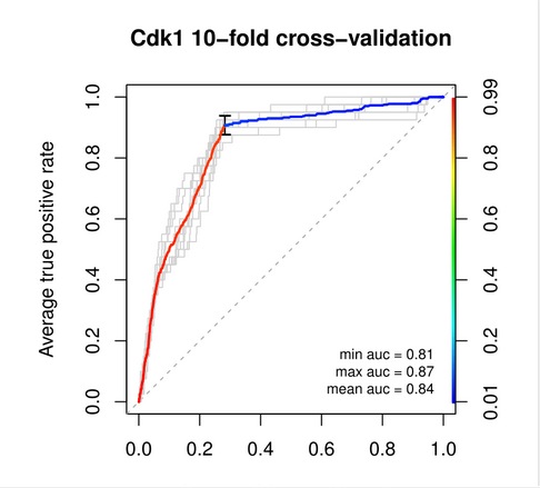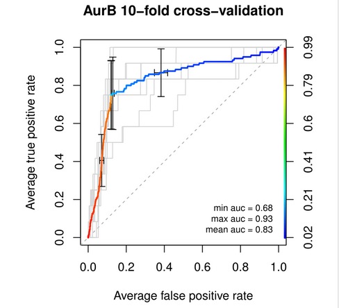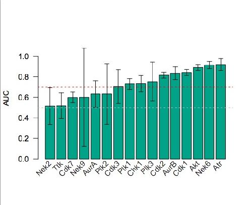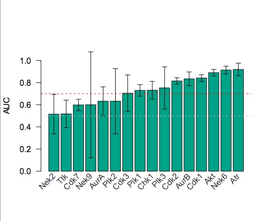 For 16 cell-cycle kinases with many known target sites (Akt, Atr, AurA, AurB, Cdk1, Cdk2, Cdk3, Cdk7, Chk1, Nek2, Nek6, Nek9, Plk1, Plk2, Plk3, Ttk), position specific scoring matrices (PSSMs) were derived for each kinase and benchmarked on a set of known target sites using a cross-fold validation 16. We show here the AROC curves for the cross validation for each kinase. |