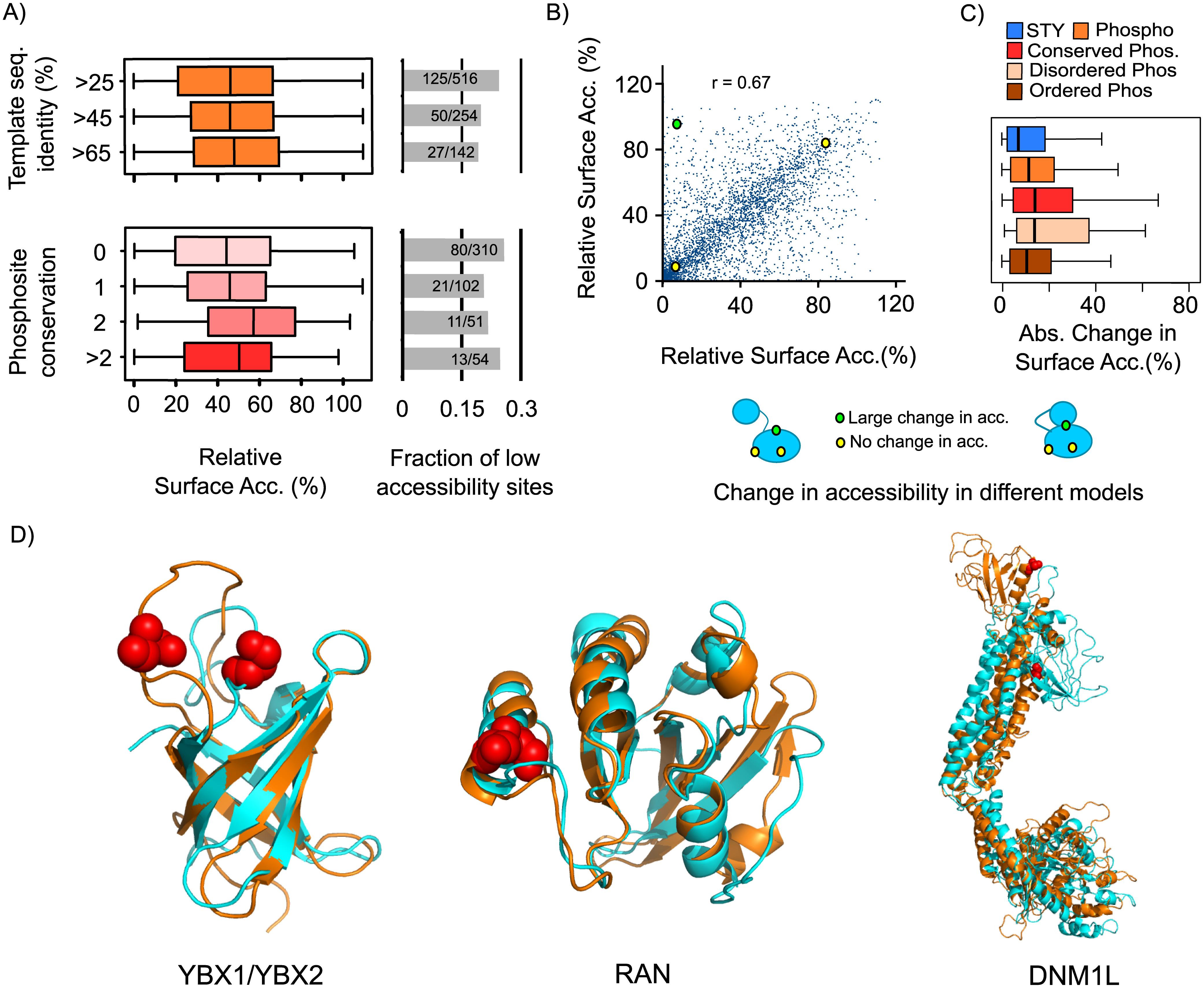 A) A small fraction of phosphosites (approximately 20%) was observed to be at solvent inaccessible positions (defined here as <20% all-atom RSA). The distribution of phosphosite RSA and the fraction of low accessibility sites do not vary significantly as a function of target-templates sequence identity nor phosphosite conservation. B) For phospho-acceptor residues (Serine, Threonine and Tyrosine) modeled independently based on more than one template structure, we compared the RSA values obtained from different models. These values are highly correlated, although some sites showed large variability in predicted accessibility, potentially indicating regions of conformational flexibility. C) We compared the changes in RSA in different models for phospho-acceptor residues, phosphoryation sites not known to be conserved, those conserved in at least 1 other species, phosphosites predicted by DISOPRED to be in ordered or disordered regions. D) Examples of phosphosites found in positions that show a large change in accessibility in two templates and are poorly accessibility in one of the templates. The phosphosite position is highlighted in red and the models in orange have a higher RSA for the phosphosite position when compared to the model in cyan.