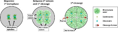 Cleavage pattern in a bispermic frog egg. Metaphase spindles in Xenopus are ∼50–60 μm long in a 1.2-mm egg. After anaphase onset, the small asters at the spindle poles grow steadily until they fill the cell. Asters from the two poles of the same spindle (sister asters) contact each other soon after anaphase onset at the plane previously occupied by the metaphase plate. Asters from the poles of two different spindles (nonsister asters) contact each other later. In both cases, aster growth halts where the asters contact each other, and a zone of lower microtubule density is observed at the aster–aster interaction zone (gray shading). When asters grow to touch the cortex, furrows initiate between sister aster pairs but not between nonsister pairs. Adapted from Brachet (1910), Wühr et al. (2009), Snook et al. (2011), and Mitchison et al. (2012). |