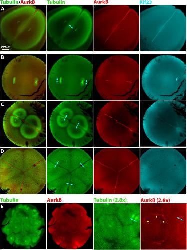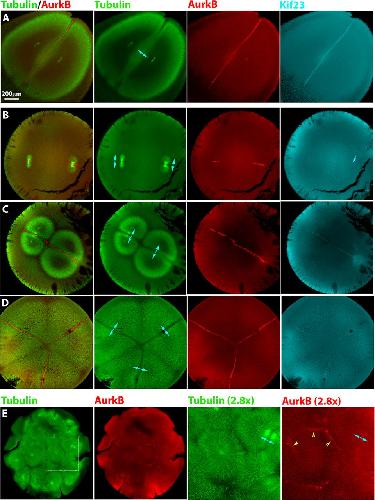 FIGURE 2: Localization of furrow-inducing protein complexes in polyspermic eggs. Eggs were fixed between first mitosis and first cleavage, stained for AurkB (a subunit of the CPC) and Kif23 (a subunit of Centralspindlin), and imaged by confocal microscopy. Cyan double-headed arrows illustrate sister aster pairs. (A) Normal, monospermic egg. Note plane of CPC- and Centralspindlin-positive microtubule bundles between sister asters. (B) Bispermic egg fixed a few minutes after anaphase onset. The asters have just started to grow. A CPC-positive disk is evident at the plane previously occupied by the metaphase plate, where sister asters recently met. Centralspindlin recruitment is less evident (cyan single arrow in Kif23 image). (C) Bispermic egg fixed midway between anaphase and cleavage. Interaction zones between sister and nonsister asters were evident in the tubulin image. Note a brighter tuft of microtubules that connects the sister pair to the upper left, in register with the centrosomes. This midzone-like morphological marker reveals the previous position of the spindle and was used to identify sister aster pairs in microtubule images. CPC and Centralspindlin have been recruited to the interaction zone between sister asters but not to the zone between nonsister asters. (D) Egg with four sperm fixed early in cleavage. Cleavage has initiated near the animal pole (not shown). This image shows a focal plane near the equator, where three aster pairs are visible. Furrowing had not yet occurred in this focal plane, but asters had grown all the way to the cortex. Note selective recruitment of CPC and Centralspindlin to zones between sister asters. (E) Highly polyspermic egg fixed early in cleavage. The region presented at higher magnification shows a single aster with CPC-positive zones at the junction with several neighboring asters (yellow arrowheads). None of these are zones with its sister aster, which is in a different z-plane. |