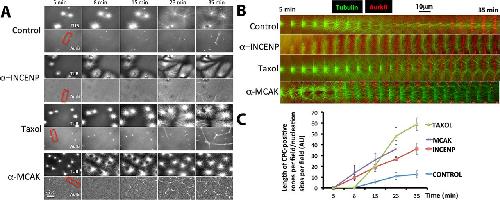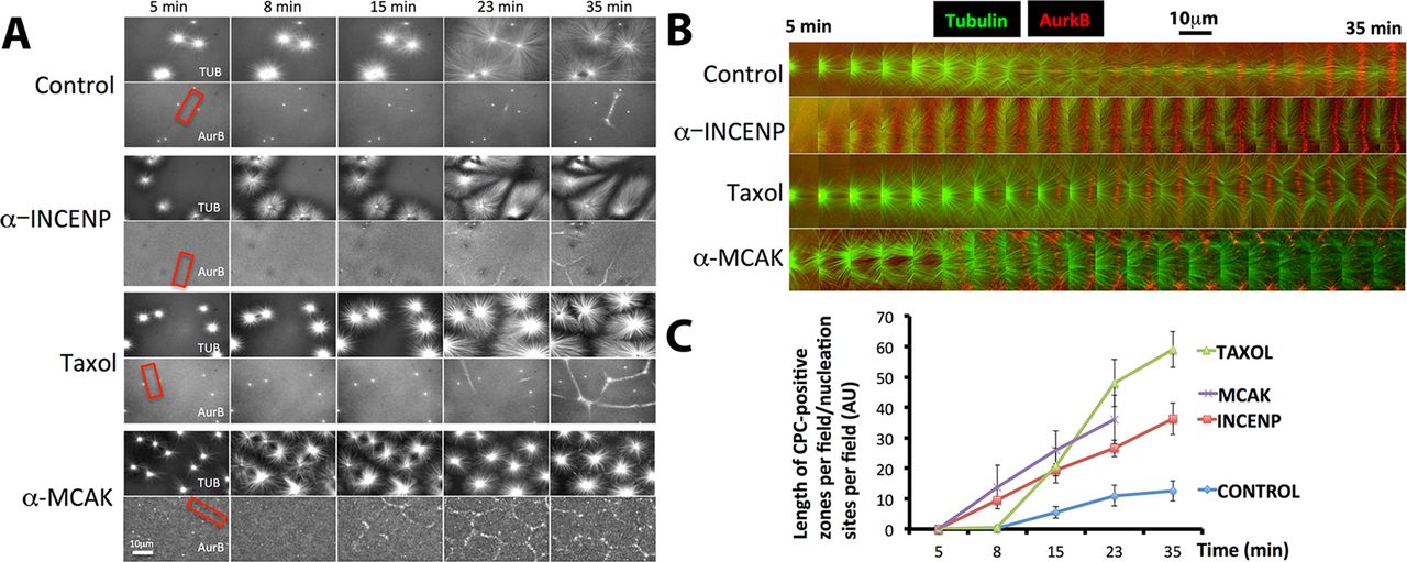 FIGURE 5:. Forced activation of the CPC promotes recruitment in the extract system. Interphase egg extracts containing fluorescence probes for tubulin and the CPC (directly labeled anti-AurkB) and beads coated with anti-AurkA as artificial centrosomes. (A) Representative images from time-lapse sequences collected in parallel from the same preparation of extract. Note that more CPC-positive zones were formed between nucleating sites in extracts treated with activating IgG to INCENP, Taxol (0.5 μM final), and inhibitory IgG to MCAK than in control. Once formed, CPC-positive zones were stable for the duration of experiments under all conditions except MCAK inhibition, where they formed early relative to control but then decayed. (B) Higher-magnification image sequences of the regions shown by red boxes in A. Regions were chosen to highlight the establishment and growth of CPC-positive zones between nucleating sites. Note that the zone from control and Taxol-treated extracts grows laterally after it initiates. CPC-positive zones formed earlier when the CPC was activated or microtubules were stabilized. (C) Quantification of CPC-positive zone formation from multiple image fields. At each time point, the length of CPC-positive zones in a field was measured and divided by the number of nucleating beads in the field. Note that CPC stimulation (anti-INCENP), Taxol, and MCAK inhibition all stimulated the rate and extent of CPC-positive zone formation. The last time point was omitted from the MCAK inhibition experiment because CPC-positive zones were unstable under this condition. With regard to A, see Supplemental Movies S5A Control and S5B Taxol. |