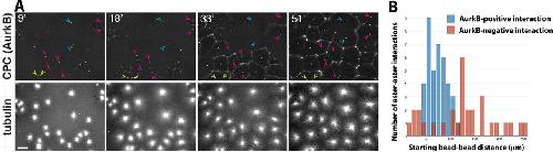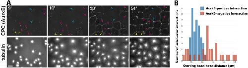 FIGURE 6: Initial distance between nucleating sites influences CPC recruitment. The same experiment as in Figure 5 was performed without molecular perturbations. The CPC probe is directly labeled anti-AurkB, and beads coated with anti-AurkA are the aster nucleators. Bead pairs were identified based on whether their asters interacted at the end of the movie. The distance between the bead pairs was measured at the start of the movie, and whether or not a CPC-positive zone formed between beads was scored upon initial aster–aster contact. (A) Example images from a time-lapse sequence. Arrowheads indicate typical bead pairs. Yellow and blue show examples where AurkB-positive zones did not form between beads; magenta shows examples where AurkB-positive zones did form. Note that the yellow arrowheads are close together (n = 2), blue arrowheads are further apart (n = 7), and magenta arrowheads are separated by an intermediate distance (n = 15). (B). Histogram of initial bead separations plotted separately for bead pairs where an AurkB-positive zone did (blue bars; n = 39) or did not (red bars; n = 30) form upon aster–aster contact. Initial distances were pooled for multiple fields imaged in parallel in two independent experiments (six fields total). Note that the initial separation distance was unimodal for bead pairs for which a CPC-positive zone did form. The distribution was much more spread out, and possibly bimodal, for bead pairs for which a CPC-positive zone did not form. |
